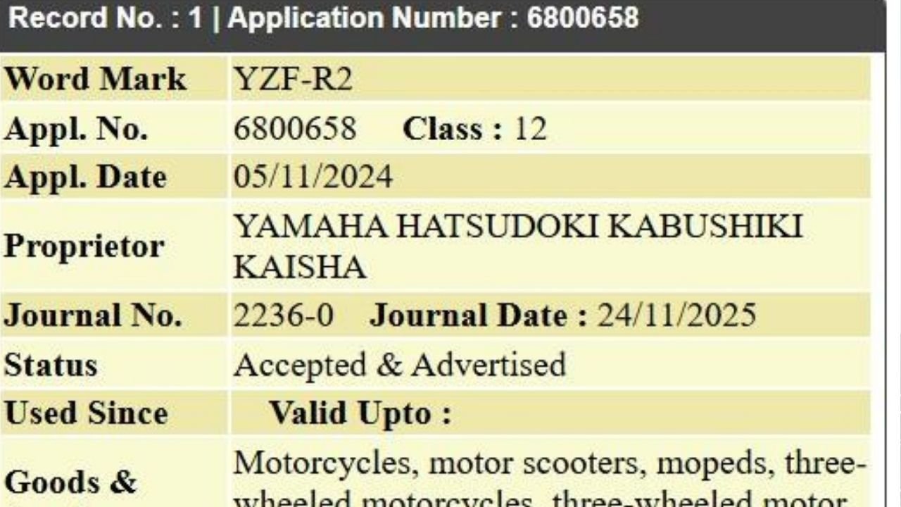 Yamaha R2 के लॉन्‍च से पहले की प्रोसेस में अब इस बाइक का नाम इंडिया में ट्रेडमार्क हो गया है। जिसके बाद यह माना जा रहा है कि अब 2026 में इस बाइक को इंडियन मार्केट में कभी भी लॉन्‍च किया जा सकता है।